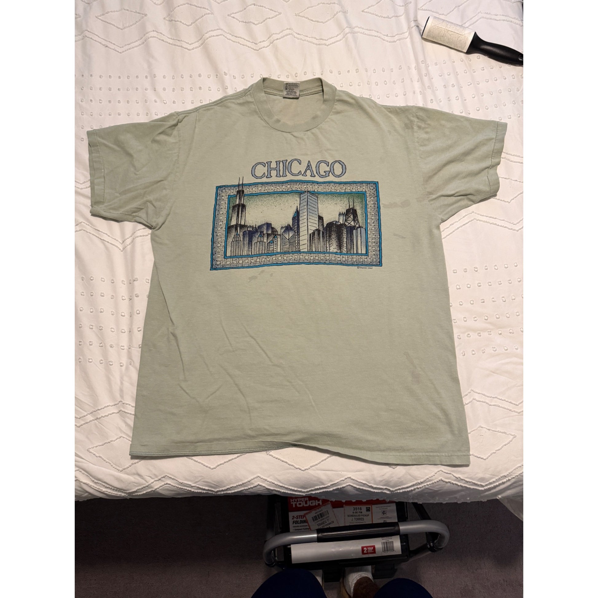 Vintage Anvil short sleeve souvenir T-shirt featuring a bold Chicago graphic. Classic crewneck design in soft cotton, perfect for collectors, streetwear enthusiasts, or anyone wanting a nostalgic piece of Windy City style.