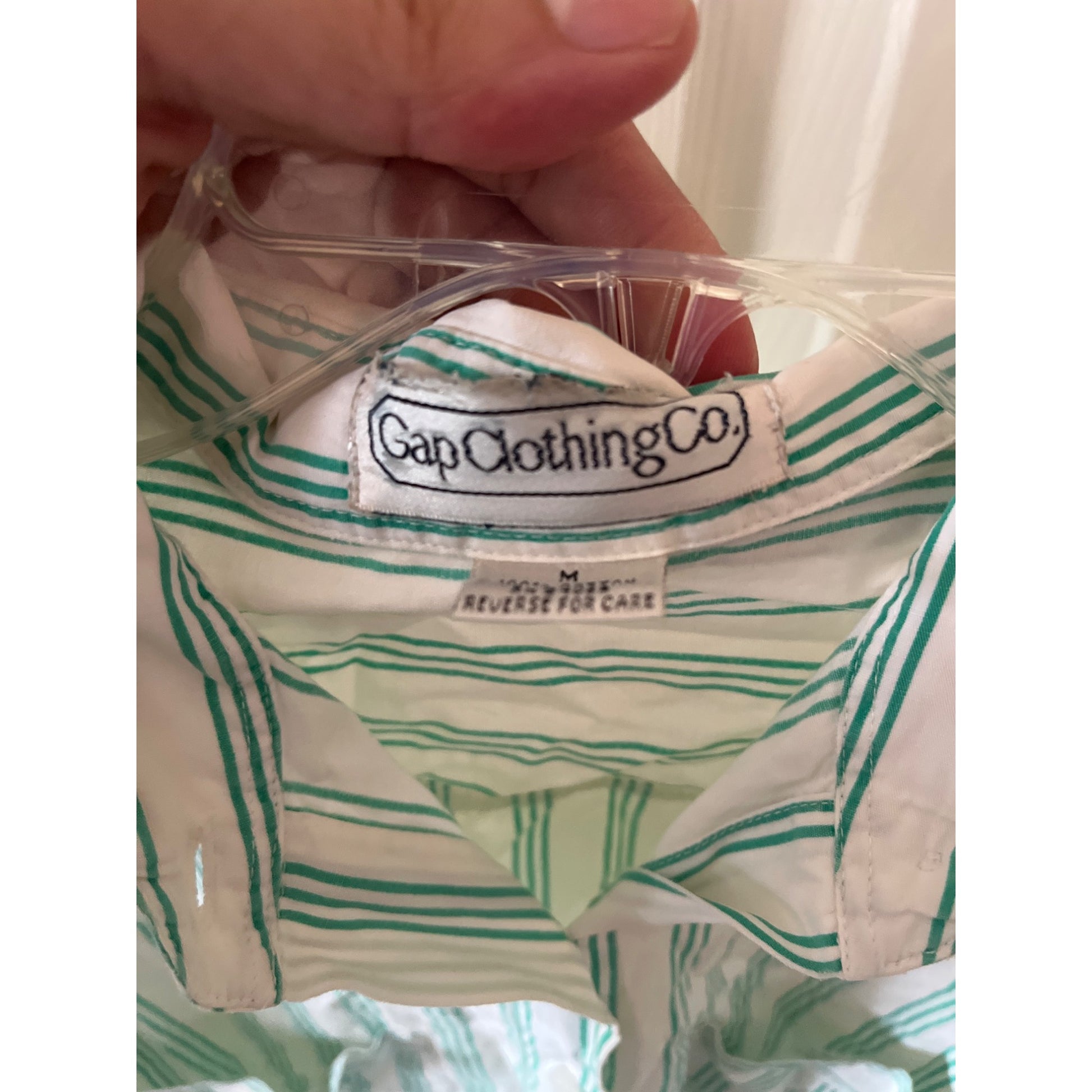 Gap Clothing Co striped button-up shirt in green and white, men’s size M. A clean, preppy piece perfect for casual wear or layering, featuring a relaxed fit and lightweight fabric.