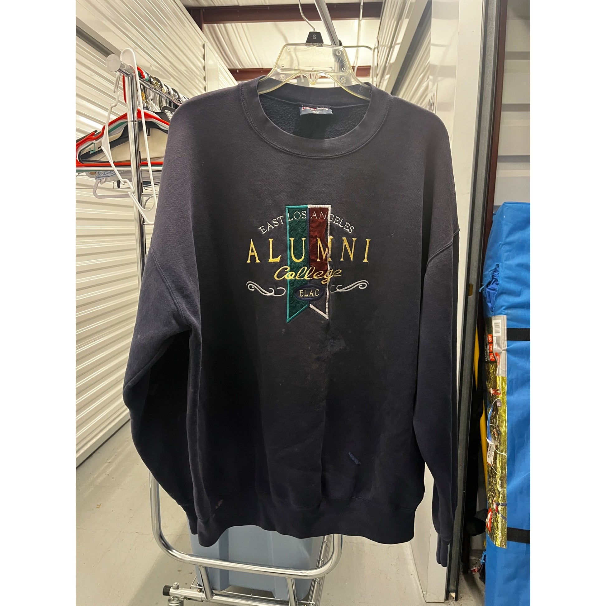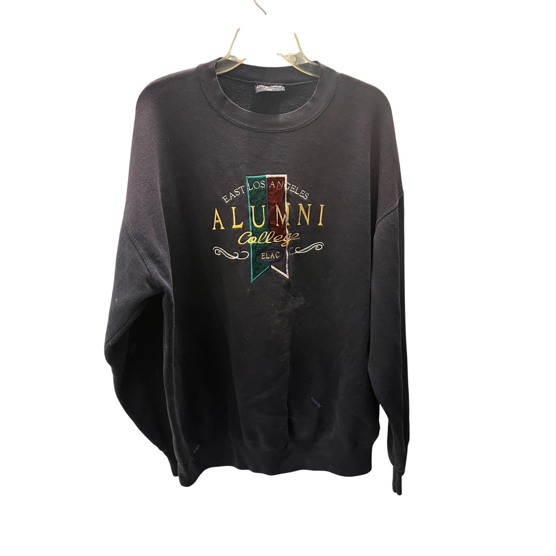 Discover this thrifted Jansport pullover sweater in heather grey, size XL, featuring East Los Angeles College lettering. Perfect for vintage lovers, campus style, or casual everyday wear, it features a classic Y2K collegiate design with intentional distressing for added character.