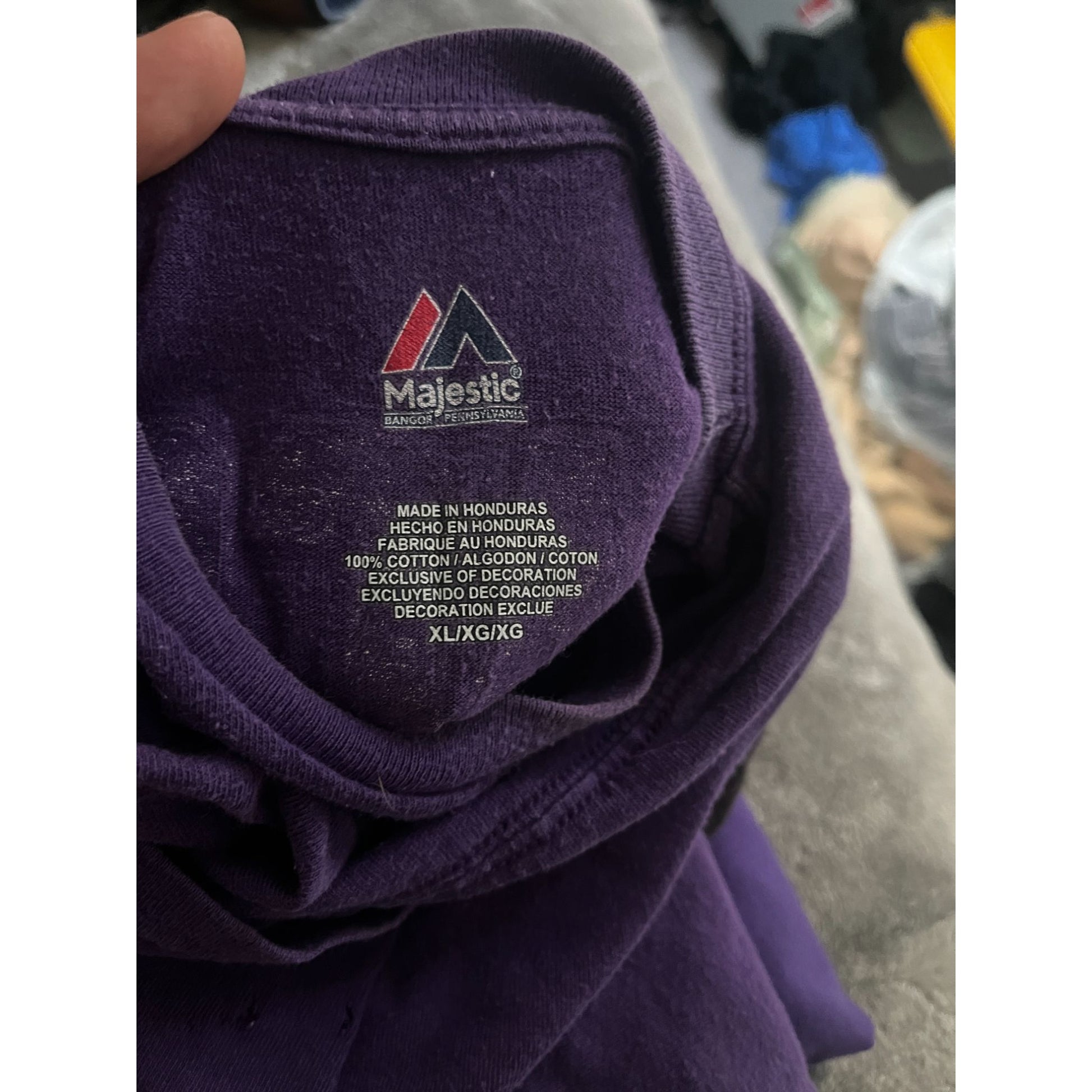 Majestic short sleeve NFL jersey-style t-shirt featuring Joe Flacco #5 of the Baltimore Ravens, in bold purple, men’s size XL. Perfect for game day, tailgates, or everyday fanwear, with screen-printed name and number graphics on soft, breathable fabric.