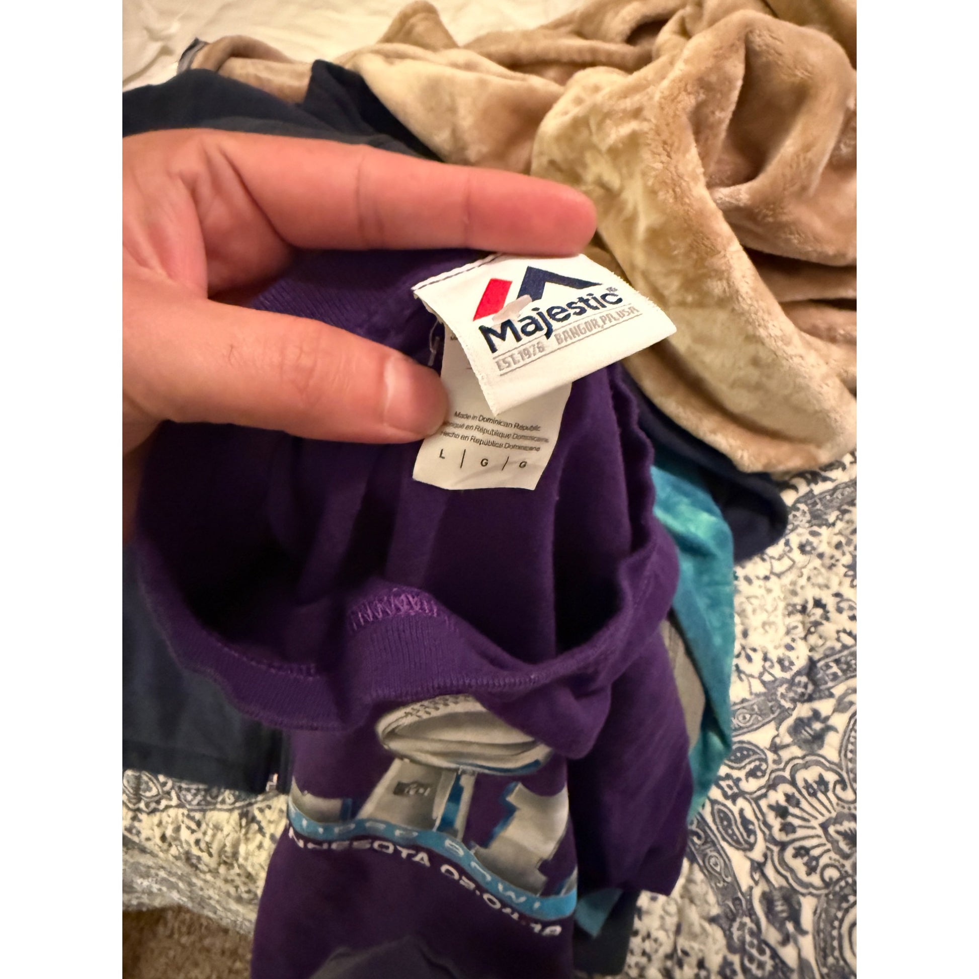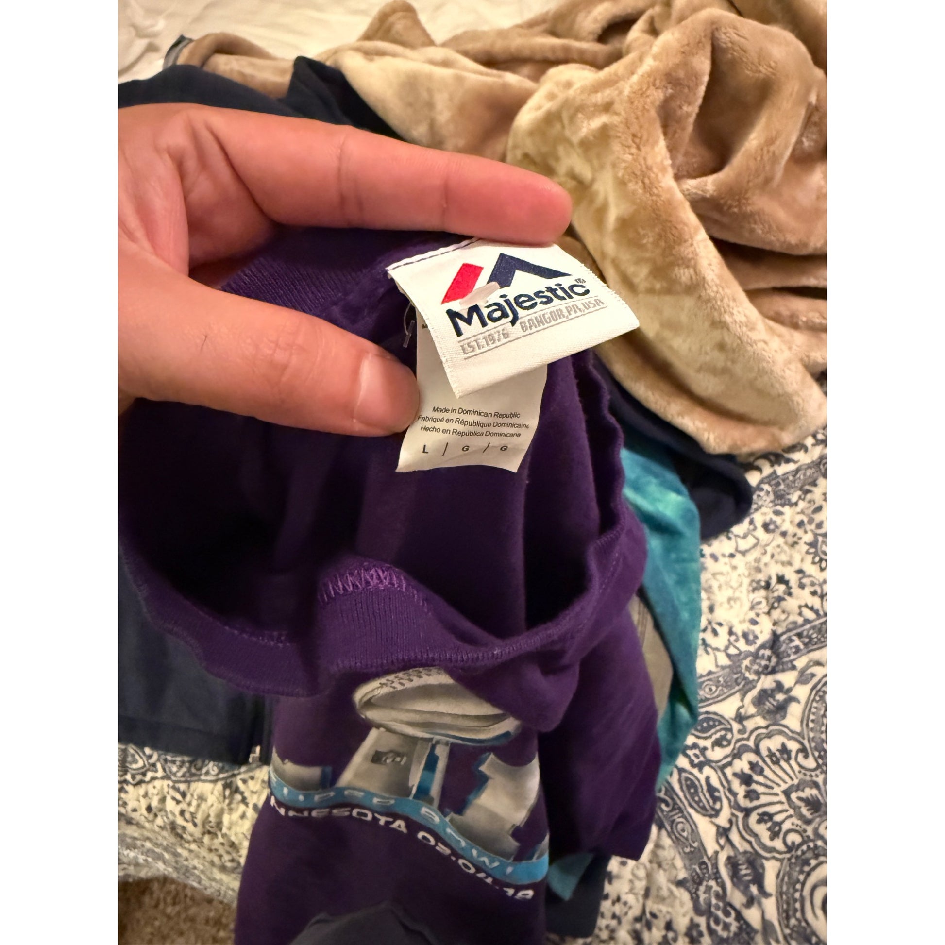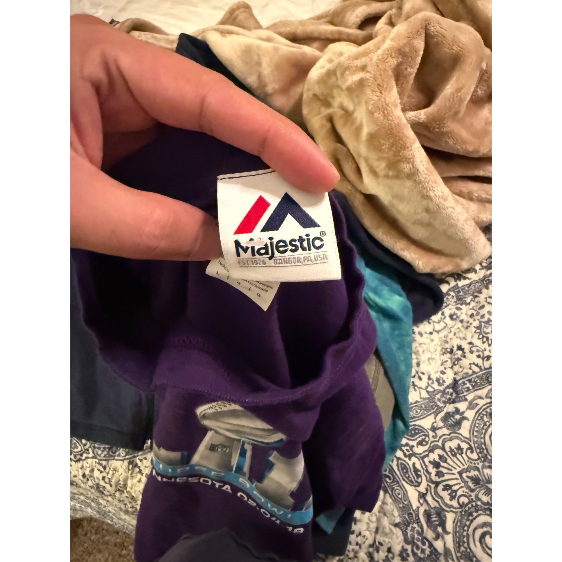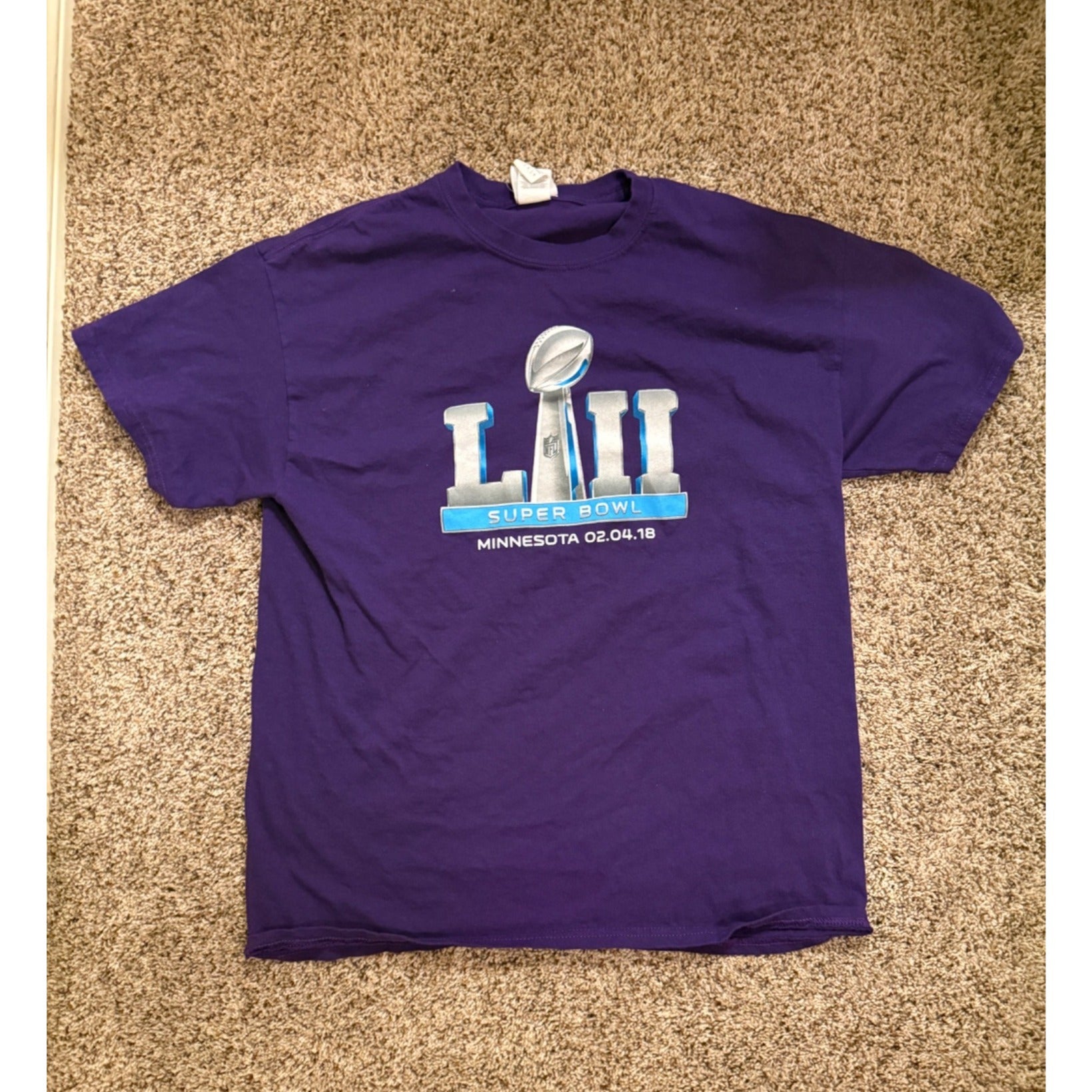 Majestic Super Bowl LII 52 Minnesota 2018 T-Shirt in purple, size L. Perfect for NFL fans and vintage sports collectors, this tee features official graphics commemorating the 2018 Super Bowl held in Minnesota.