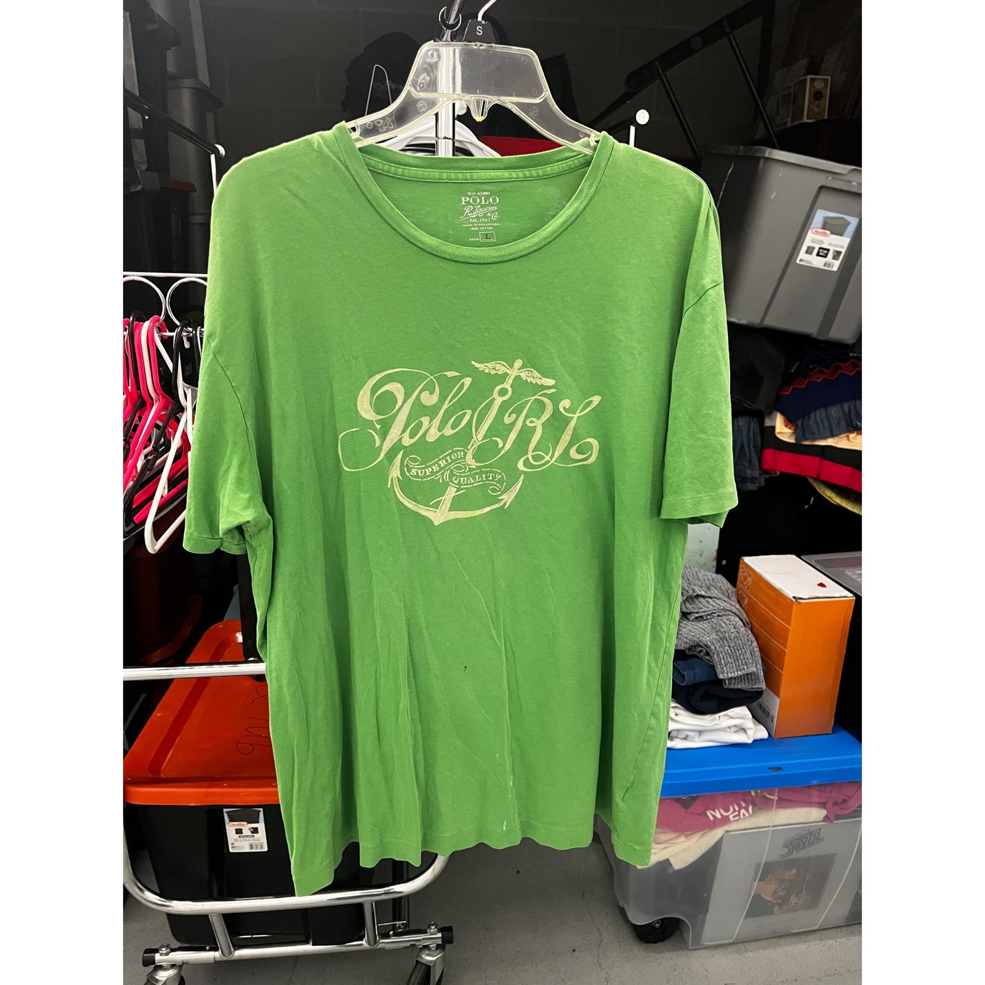 Polo Ralph Lauren casual street style graphic pullover t-shirt in green, men’s size L. Features a bold front graphic with a laid-back fit—great for everyday wear or vintage-inspired streetwear looks. Made from soft cotton with signature Polo quality.