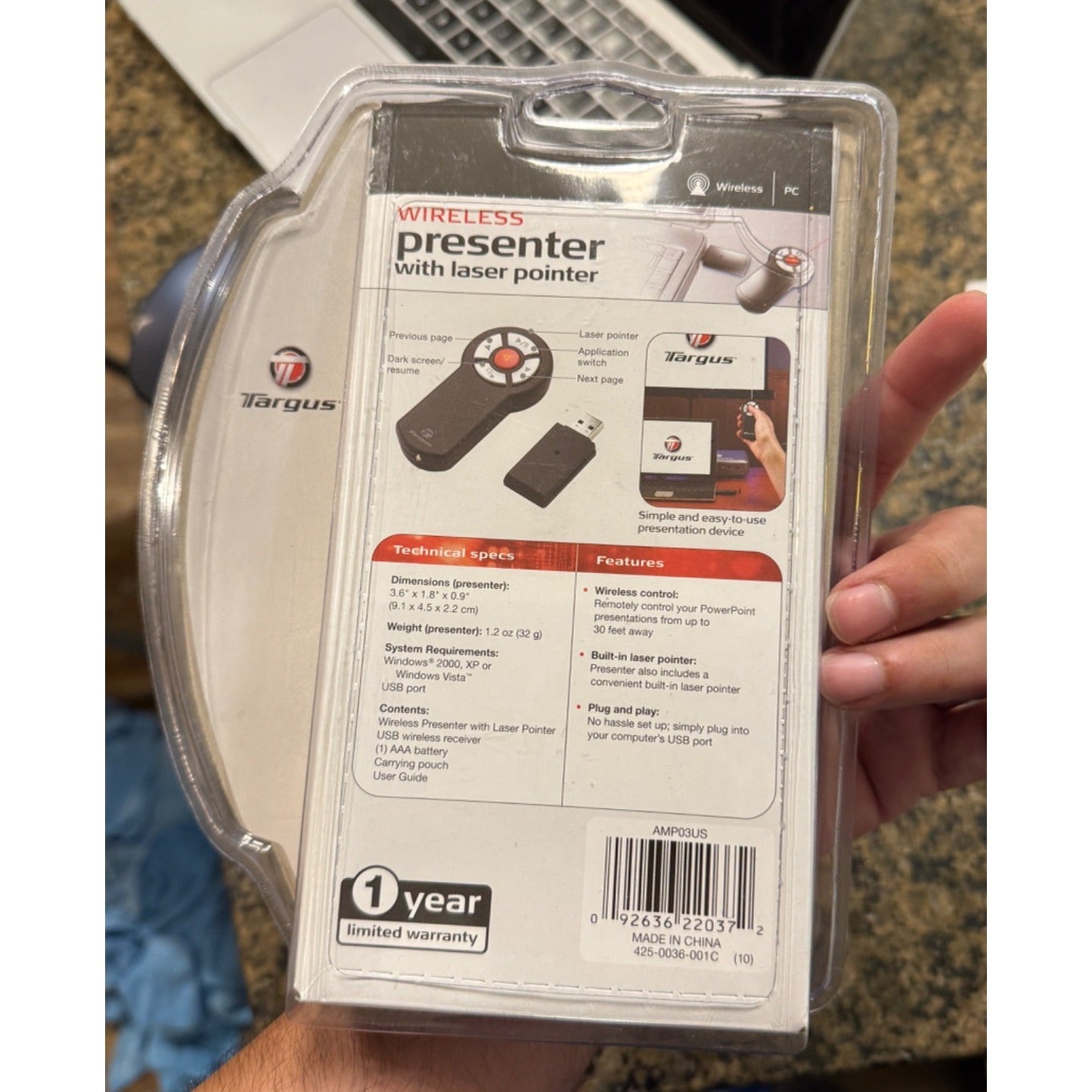 Targus Wireless Presenter Laser Pointer Remote, model AMP03US. Designed for professional presentations, this remote features intuitive button controls, built-in laser pointer for highlighting key points, and reliable wireless connectivity. Compact and lightweight for easy portability.