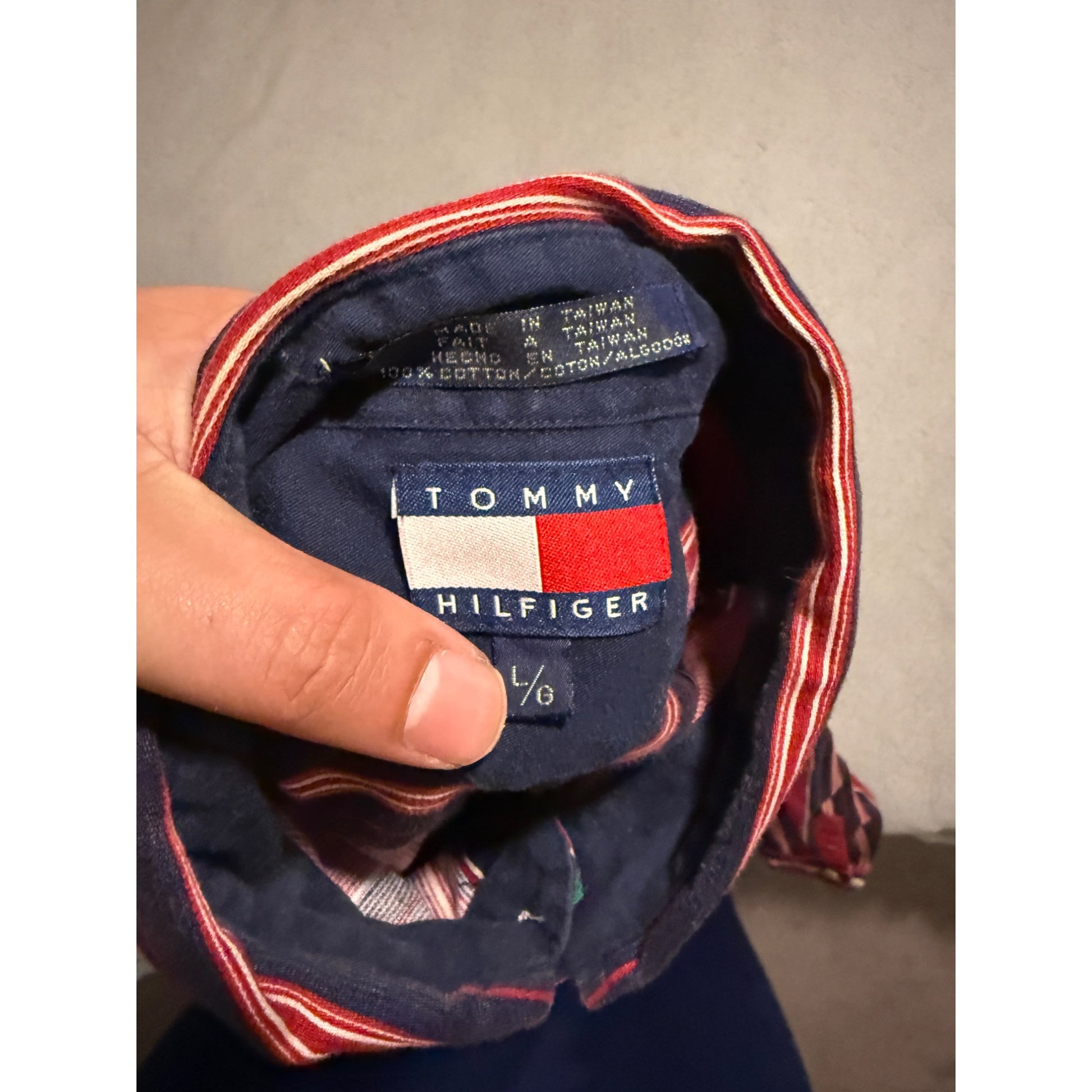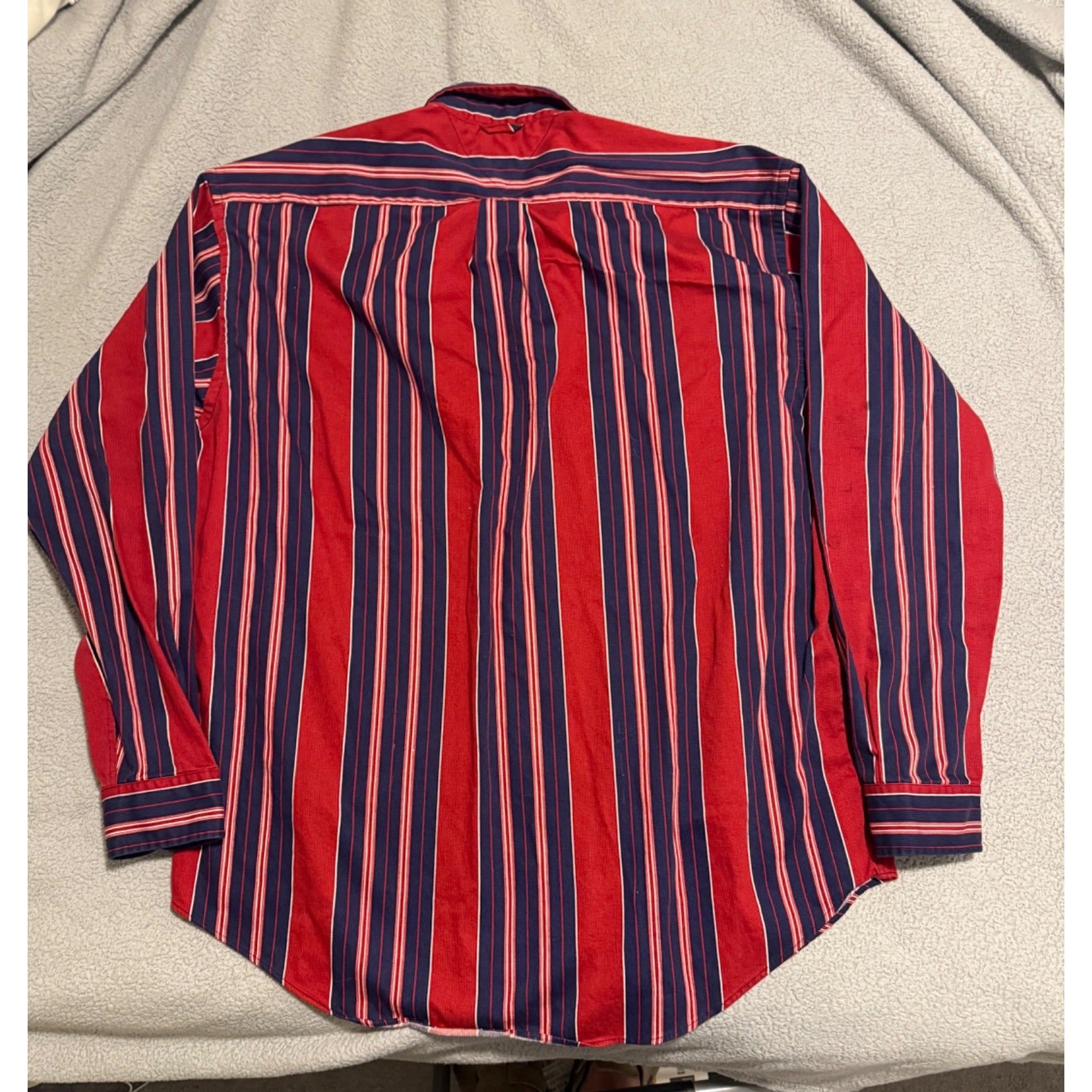 Classic Tommy Hilfiger button down in bold red and blue vertical stripes, a staple from the 1990s era. This long sleeve shirt features a crisp collar, button cuffs, and signature Tommy style—perfect for vintage streetwear looks, casual outfits, or collectors of 90s Ralph Lauren–era prep fashion.